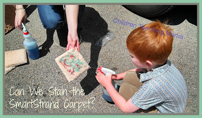 Knowing this information, we were given License to Spill! Actually, Josiah was in charge and allowed to make a mess for once! He was asked to spray a variety of staining liquids onto a piece of carpet... and boy did he! The entire piece of carpet was covered in red wine and juice stains. You can see it here:
